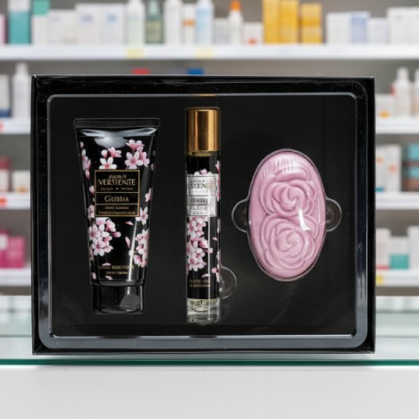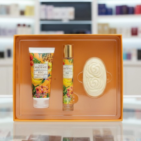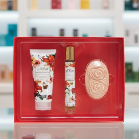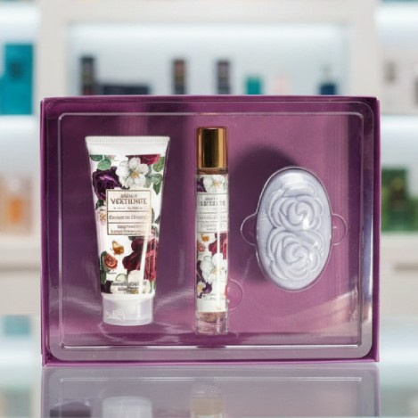 Contiene 1 body splash x 100 ml + 1 crema corporal x 100 ml + 1 jabón de tocador.